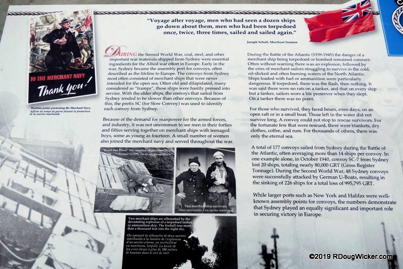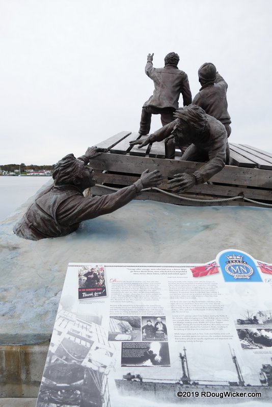 Beyond there is yet another piece of statuary of a more somber dedication. During World War II many supply ships sailed from the nearby HMCS Protection (also called Point Edward Naval Base). These vital supply ships for England were operated by the Canadian Merchant Navy, the equivalent of what we in the U.S. refer to as the Merchant Marine. It was a dangerous mission sailing slow cargo ships across a U-boat infested North Atlantic, and one in seven sailors did not survive the journey. This is the Merchant Mariners Monument: