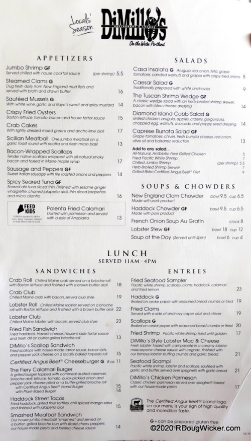 I neglected to photograph the interior, and in retrospect that was a major omission on my part. It’s beautifully appointed inside. But let’s get down to the food, starting with a look at DiMillo’s lunch menu as of October, 2019: