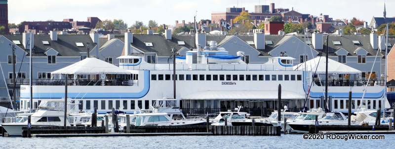 Our boat tour was almost at an end, and Ursula had planned for us a lunch at DiMillo’s by the Water. This floating restaurant is actually inside an old ferry that has quite the history: Built in 1941 as The New York (service between New Castle, Delaware and Pennsville, New Jersey); sold to Virginia in 1951 and renamed The Norfolk (service between Norfolk and Hampton); sold in 1958 to Rhode Island and renamed The Newport (service between Newport and Jamestown); Sold in 1969 to the city of Pawtucket, R.I., and used as a youth center art colony; changed hands yet again in 1977 to the Setaucket Yacht Club of Port Jefferson, N.Y. for use as a clubhouse and for boat storage; and, finally, sold in 1980 to the DiMillo family, and opened two years later as the restaurant you see here in today’s article.