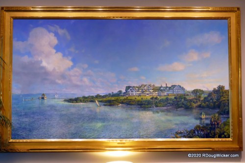 Inside are various artworks, including paintings commissioned from Christopher Still. In the painting below, titled Queen of the Gulf, every item depicted by Mr. Still is symbolic of the hotel or of past owners. This description of the work is from the Belleview-Biltmore website on the hotel’s artwork:
