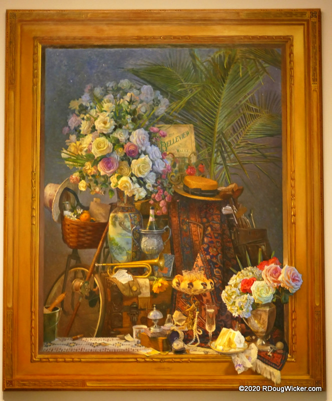 Inside are various artworks, including paintings commissioned from Christopher Still. In the painting below, titled Queen of the Gulf, every item depicted by Mr. Still is symbolic of the hotel or of past owners. This description of the work is from the Belleview-Biltmore website on the hotel’s artwork:
