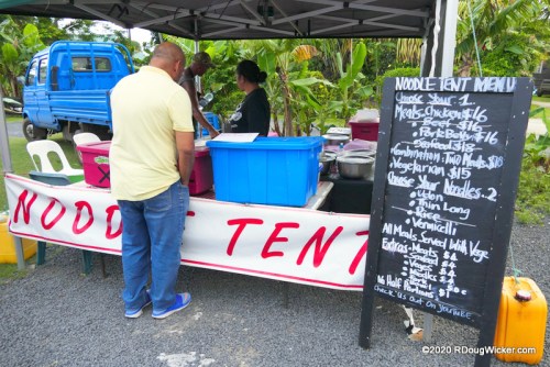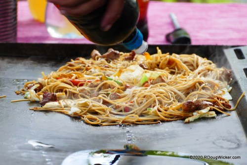 Interesting story here the first night we went — the charming lady you see above took orders and plated the food. Her husband is in the background doing the cooking. Neither had change for my order. Even so, she gave my order of noodles to me and told me to come back later. Which I did, as soon as I got change at another tent selling desserts. Here’s my scrumptious noodle order being prepared: