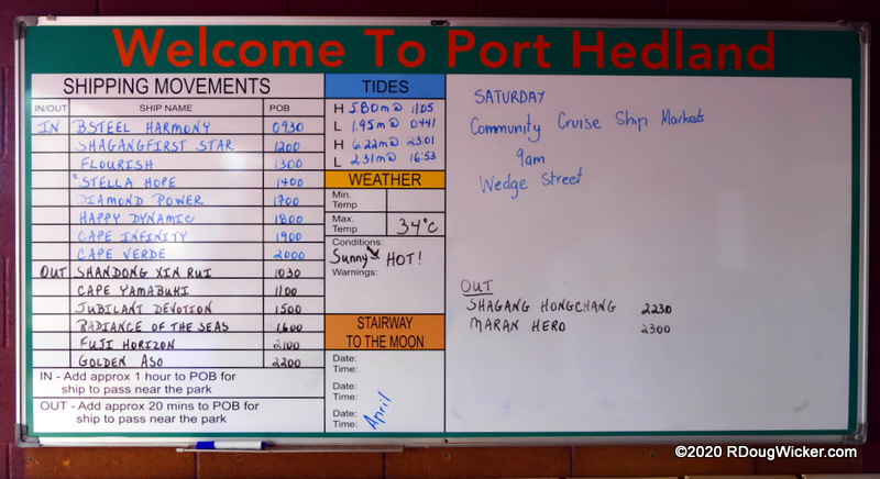 We took a free shuttle from the port into Port Hedland, and we were greeted warmly by everyone whom we met. Offloading from the bus local scout troopers even offered us cool, refreshing bottle water at no charge. That was quite welcome, for as you can see in the lead photograph above the high temperature was projected to reach 34ºC/93ºF, and that was with stifling humidity.