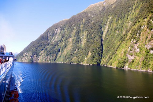 March 2019, and the weather was truly our friend as our ship Majestic Princess traversed deep into first Milford Sound, and later Doubtful Sound. I’ll go into more detail on these two areas when we view the return trip photos taken a year later. That series will start in twelve days, on 14 September. As it was, our time in Milford Sound this day started out cloudy: