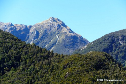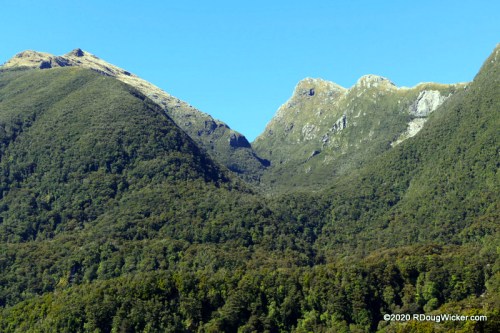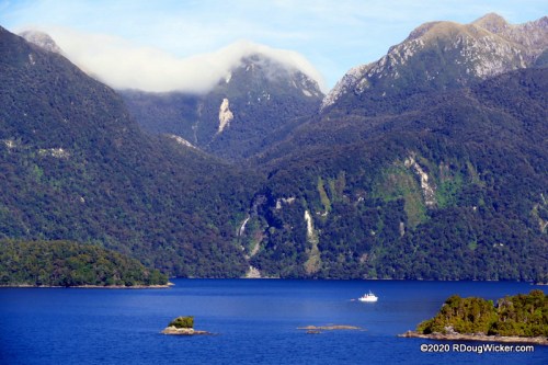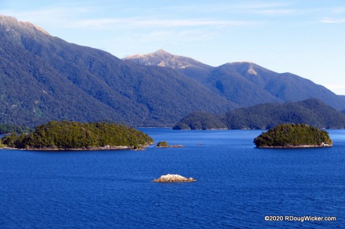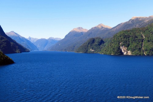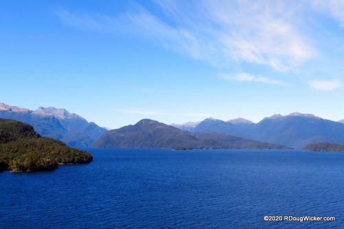 Today we’ll be looking at blue — Blue skies and blue water as Majestic Princess continues her March 2019 journey through New Zealand’s Fiordland National Park. Above you see blue water, and below we have contrail-free blue sky: