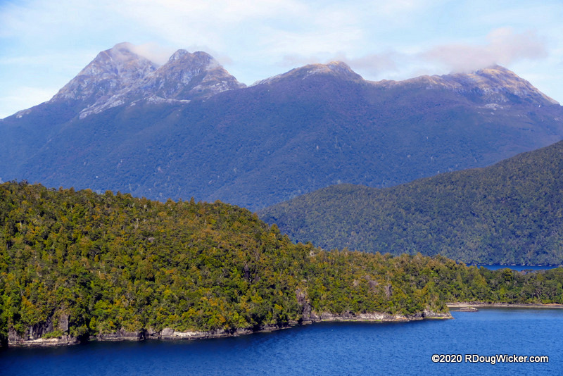 Today we’ll be looking at blue — Blue skies and blue water as Majestic Princess continues her March 2019 journey through New Zealand’s Fiordland National Park. Above you see blue water, and below we have contrail-free blue sky: