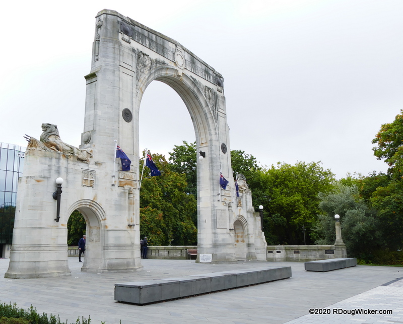 But that’s okay. We’ll hit Murphy’s again next time. Instead today we’re headed by tour bus to Christchurch. Today we’ll be spending much of our time visiting the Cardboard Cathedral (more on that in a moment), but before we do here is the archway on the Bridge of Remembrance commemorating those who lost their lives during World War I: