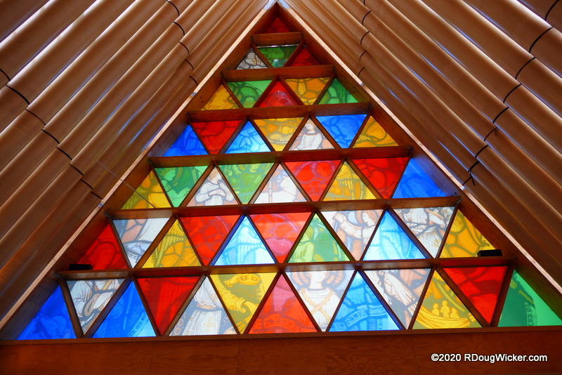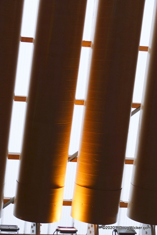 The Cardboard Cathedral rises 69 feet/21 meters. The walls are nothing more than intermodal shipping containers. The roof is comprised of polycarbonate thermoplastic. But it’s the structural supports that give this structure it’s “cardboard” designation. These immense tubes, which you can see forming the apex of the roof in the photo above consist of 24-inch/61cm cardboard tubes encasing laminated wood.