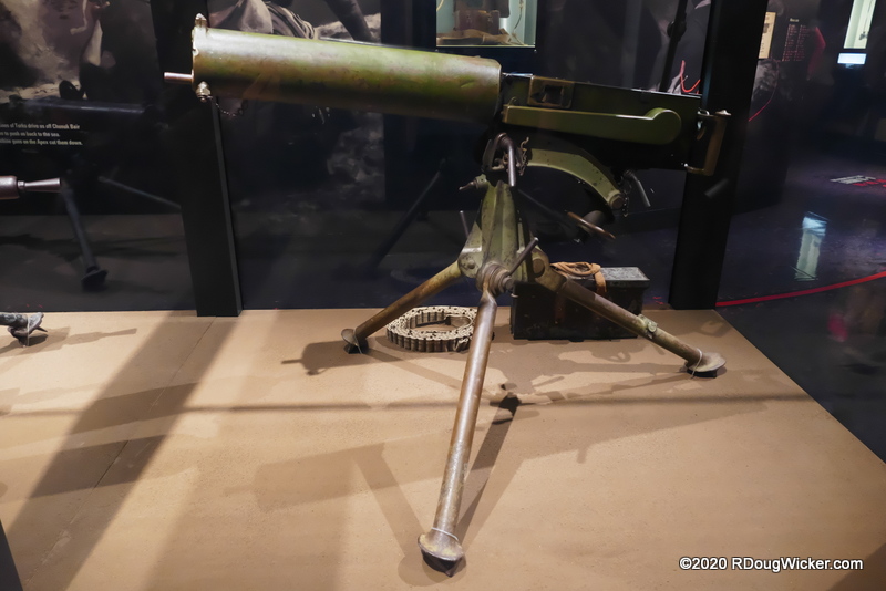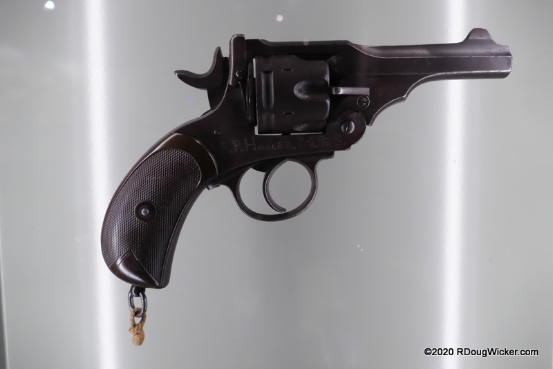 Also in the exhibit were examples of some of the weaponry used, which is of great interest to me as I’m an avid collector of firearms (as you know from some of my many firearm reviews). Here is a fine example of a Webley Mk IV service revolver chambered for the .455 Webley cartridge. The revolver is engraved with the name of a Master Gunnery Sergeant (see MGS on the inscription):