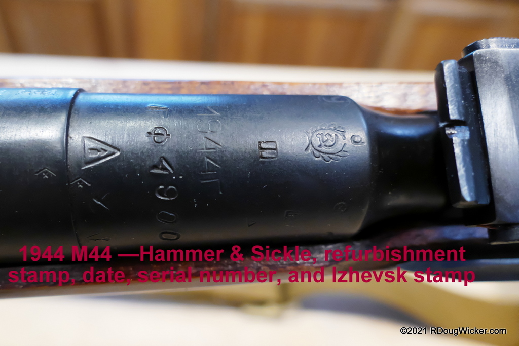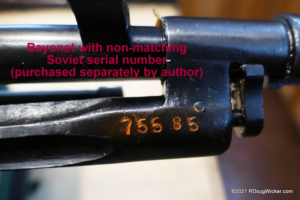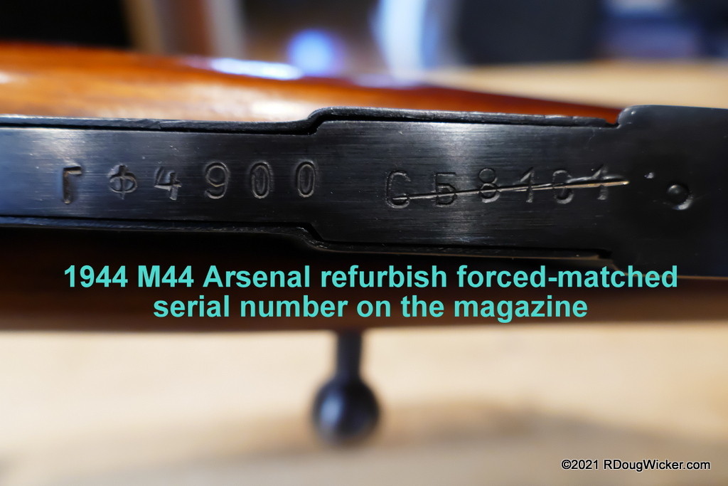 In this 1943 example the rifle has the Cyrillic serial number ДХ4849, but when you look at the magazine you’ll note that part was originally serialized to a different rifle. The importer’s serial number, the one with which BATFE are concerned, was assigned by U.S. importer PW Arms of Redmond, Washington.