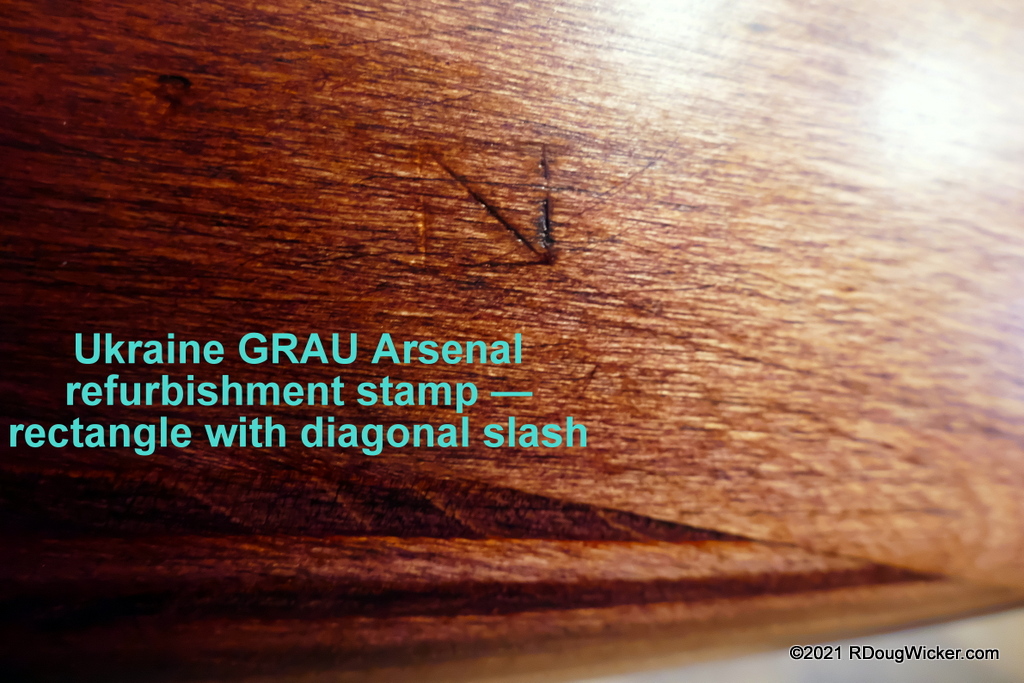 This first rifle is an “Izzie” (Izhevsk) from 1938. Serial numbers are a true match, not a “forced” match, which is unusual for an arsenal refurbished example. The arsenal refurbishment stamp on this 1938 Izzie is the square with the diagonal line through it stamped on the butt of the weapon, which indicates that this rifle was refurbished at the 1st GAU (later GRAU) Arsenal in Balakleya, Ukraine.