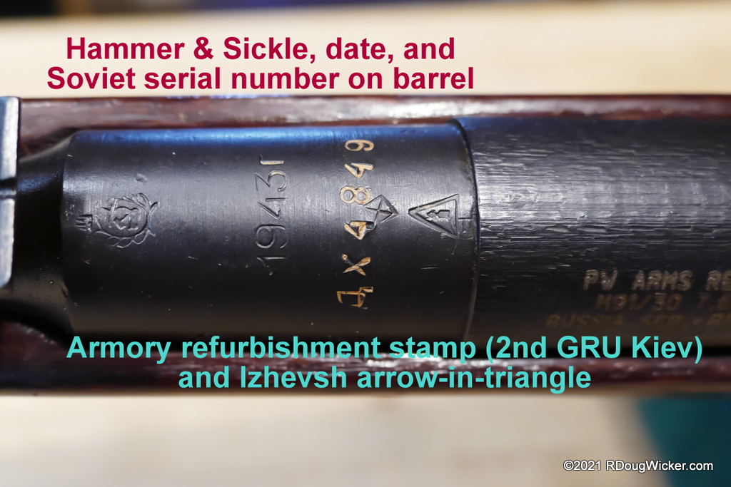 In this 1943 example the rifle has the Cyrillic serial number ДХ4849, but when you look at the magazine you’ll note that part was originally serialized to a different rifle. The importer’s serial number, the one with which BATFE are concerned, was assigned by U.S. importer PW Arms of Redmond, Washington.