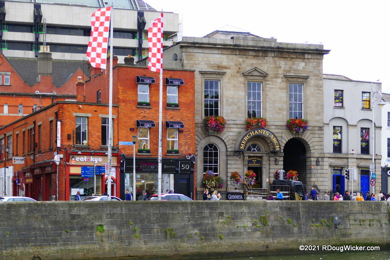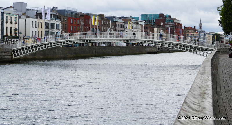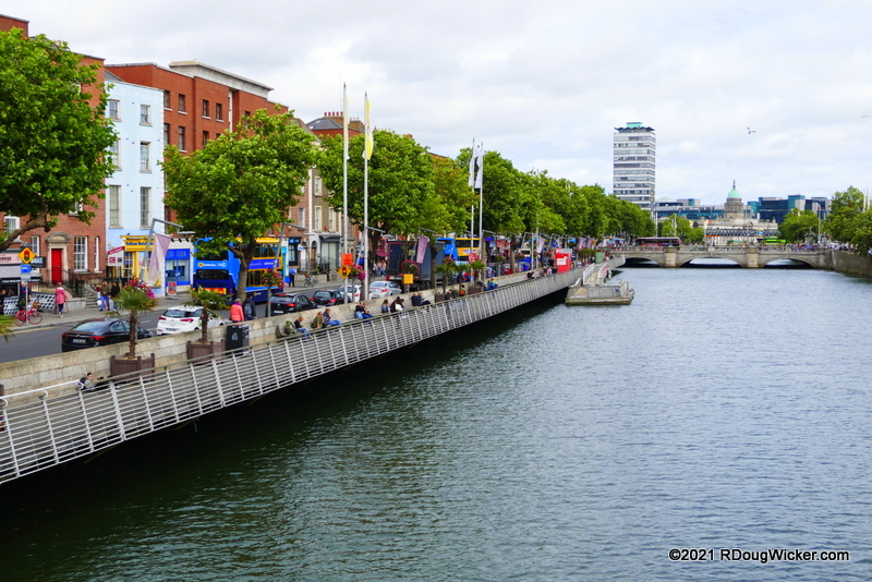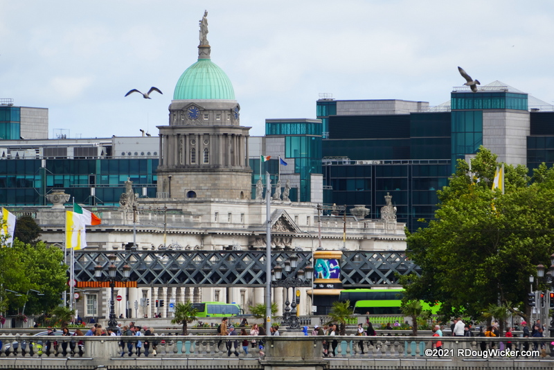 Today’s last two shots were taken from atop Ha’penny Bridge facing east. The second shot is zoomed in on the classically styled Custom House, and behind that building you can see the much more modern International Financial Services Centre: