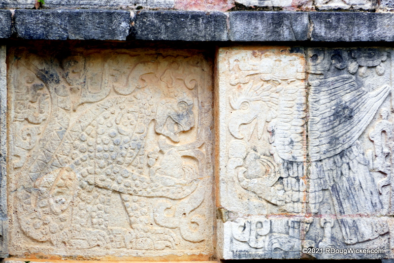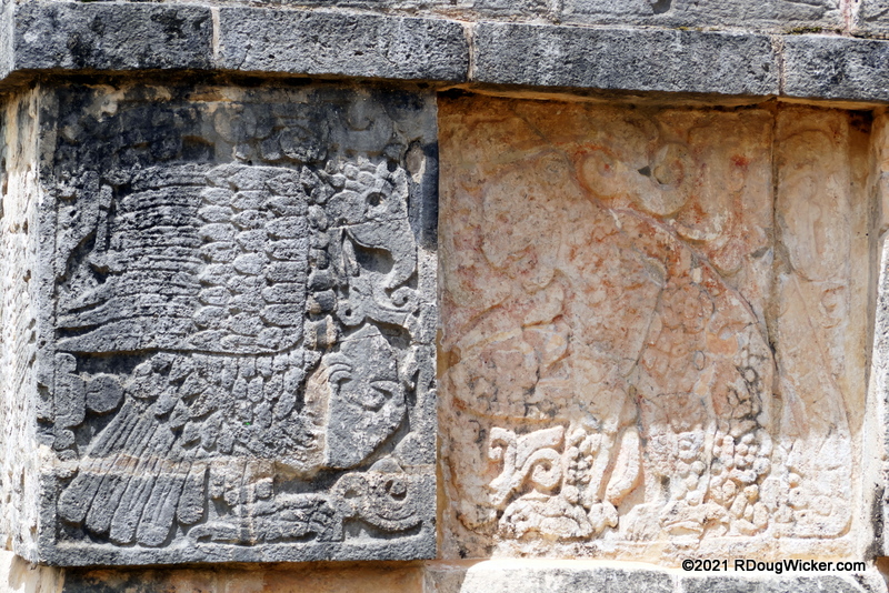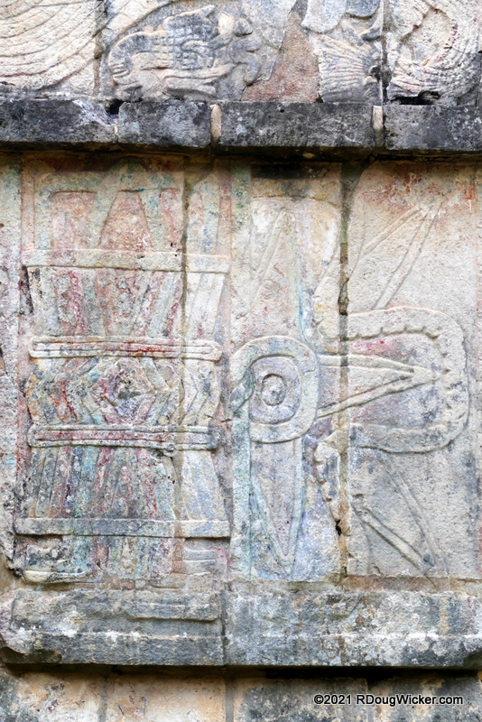 Today we’ll look at some of the more detailed stonework available for view at Chichen Itza, beginning with the intricate Mayan bas-reliefs throughout much of the façades. But don’t ask me the significance, as I have no idea. Nevertheless, they are fascinating to photograph, and they’re all over the place: