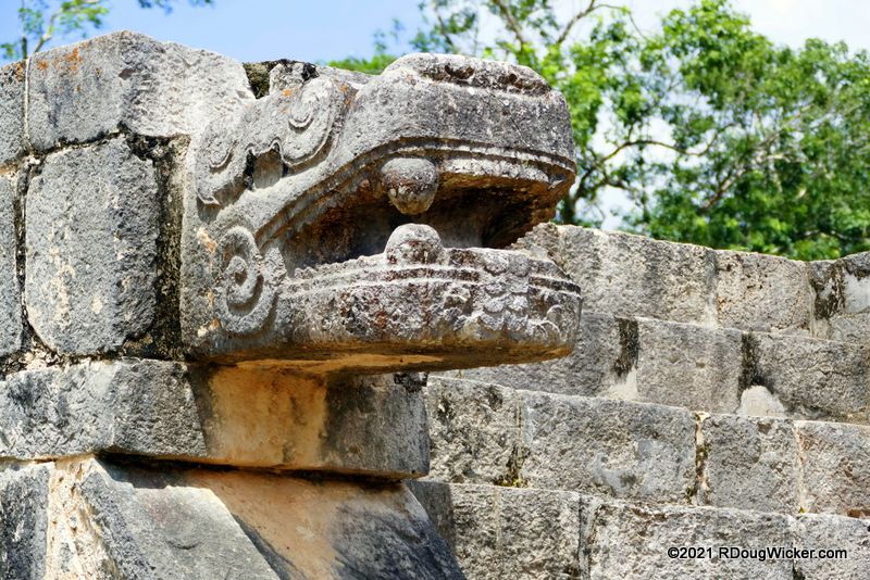 After a bit if research, it appear that the stone head below represents the Mayan Dragon (Kukulkan) that gave birth to the world. This head recurs throughout Chichen Itza.
