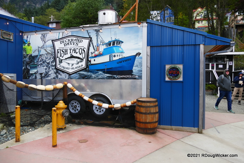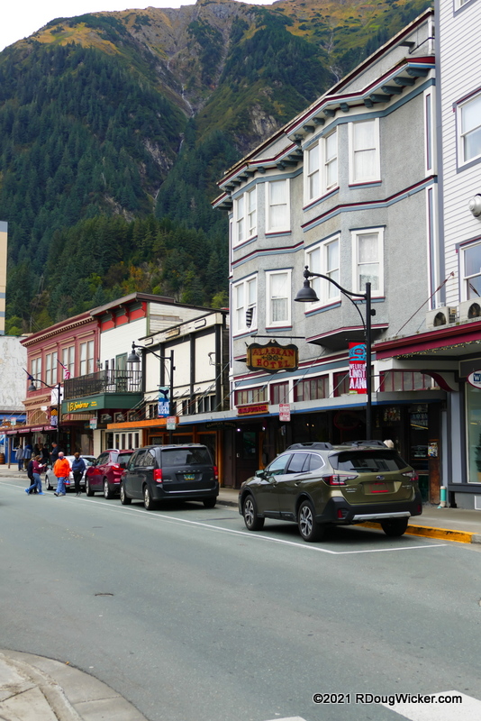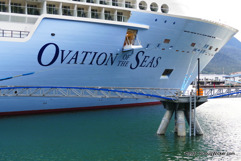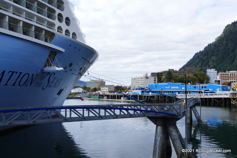 We’re still in Juneau for today’s article. And, once again, photos for this week’s Juneau experience were taken either during Voyage 1 (26 September 2021) or Voyage 2 (4 October 2021). The easy way to tell which day is which is to look at the sky. Voyage 1 we encountered clouds and intermittent drizzle, while Voyage 2 gave us bright, sunny skies. The image above was taken shortly after 2:00 p.m. on the 26th, shortly after our late arrival into Juneau. Here’s Ovation later that afternoon, as we headed back aboard to prepare for dinner: