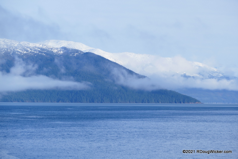 As far as 4 October being the sunnier of our two visits during the fall of this year, there was one exception. As I mentioned on Monday, we did encounter a bit of fog during our morning sail through Stephens Passage heading into Juneau. But the fog gave a nice contrast to the show topped mountains along the way: