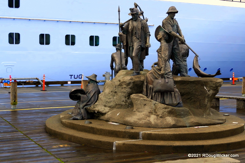 Well, we’ve waited long enough. Time to grab umbrellas and venture out onto the streets, beginning with this dockside statue entitled “The Rock” dedicated to historical figures from Ketchikan’s past: