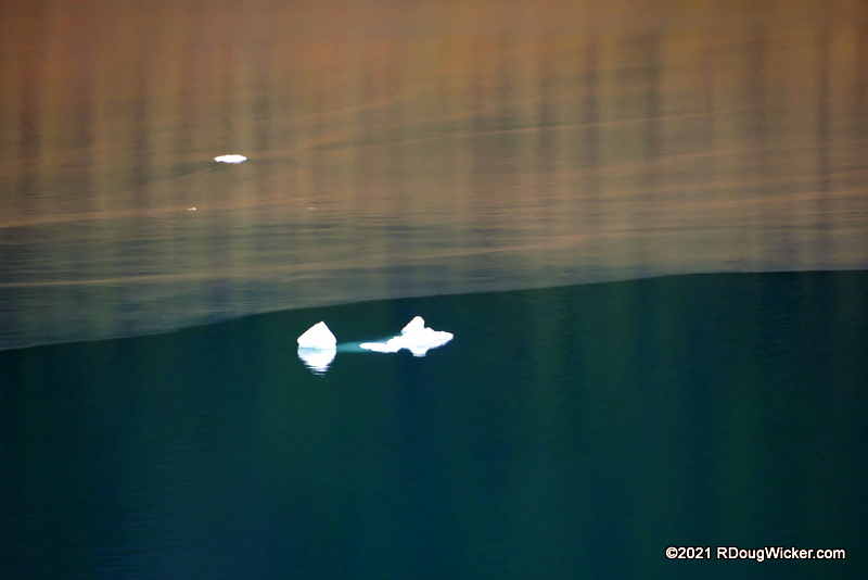 Endicott Arm is but one of two steep-walled fiords contained within the Tracy Arm-Fords Terror Wilderness. On these back-to-back voyages into this area, we would pass by Tracy Arm and continue on through Endicott Arm to arrive for a brief visit to Dawes Glacier. But before we get to Dawes, let’s look at what happens when glacial fiords meet. The muddy water at the top of the photo below is coming off Tracy Arm, and the green glacial waters below are along Endicott Arm: