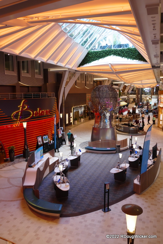 So, the Boardwalk neighborhood is located on Deck 6 aft. Meanwhile Central Park meanders through the central portion of Harmony on Deck 8. Below is a view from above of both Central Park and the balcony suites that overlook this neighborhood:
