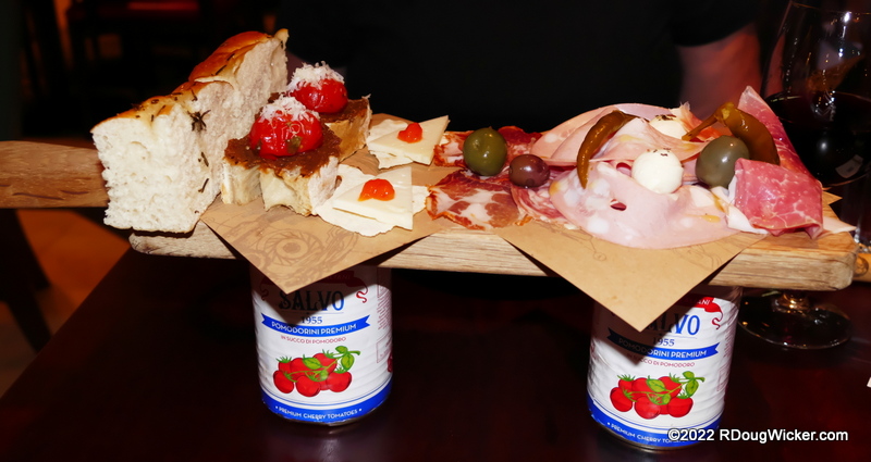 Ursula was eager for us to dive into the Our Famous Meat Plank, which she adorned from our previous experience aboard Ovation. This appetizer includes prosciutto, Tuscan fennel salad, various olives, focaccia, pecorino sardo topped with a chili jam, bocconcini mozzerella, coppa picante, a pistachio mortadella, and a tomato-topped crostini.
