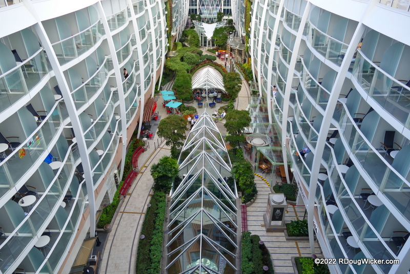 So, the Boardwalk neighborhood is located on Deck 6 aft. Meanwhile Central Park meanders through the central portion of Harmony on Deck 8. Below is a view from above of both Central Park and the balcony suites that overlook this neighborhood: