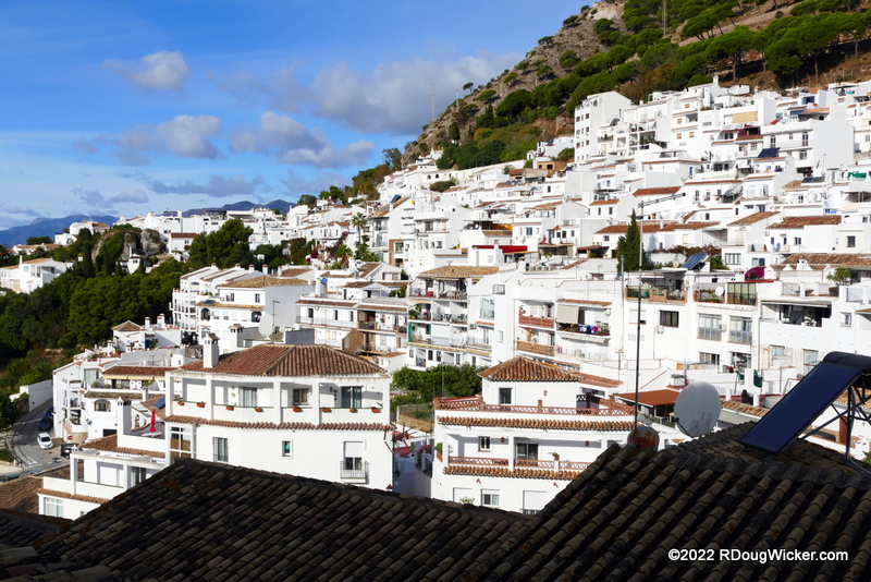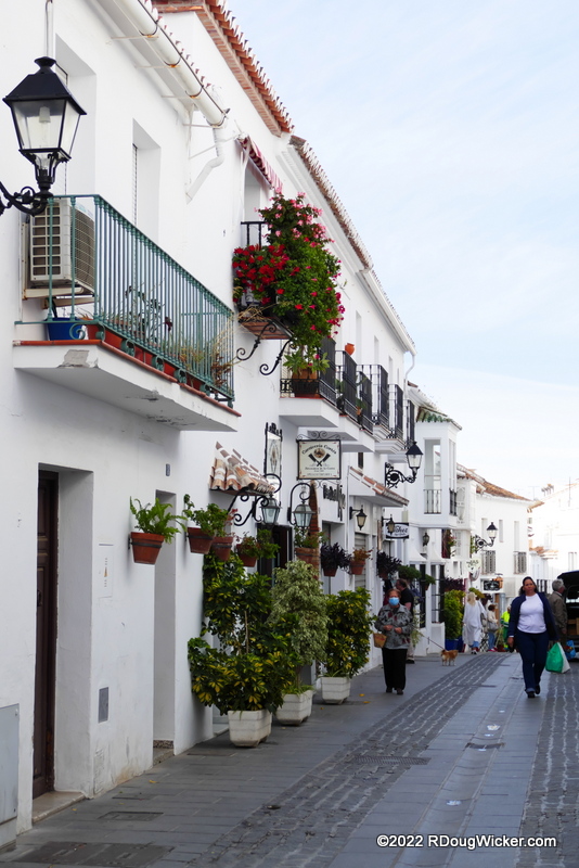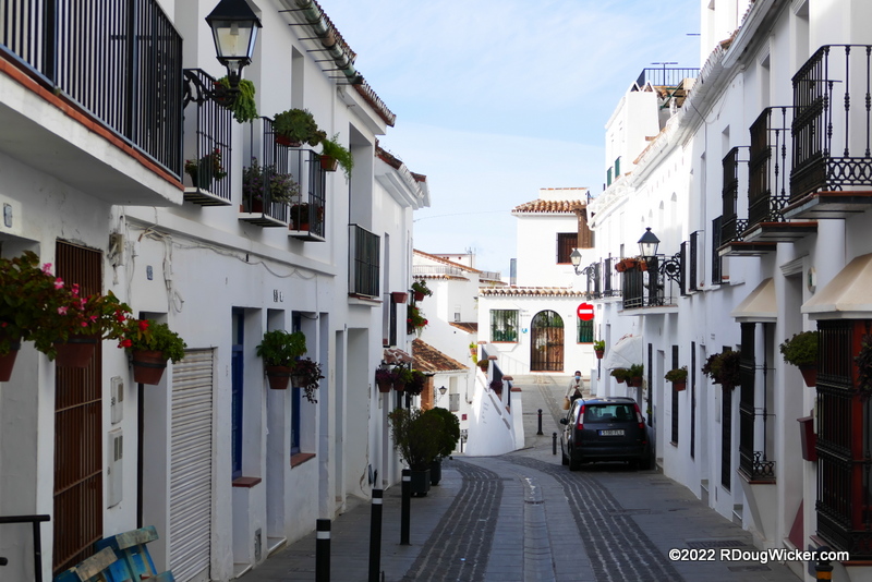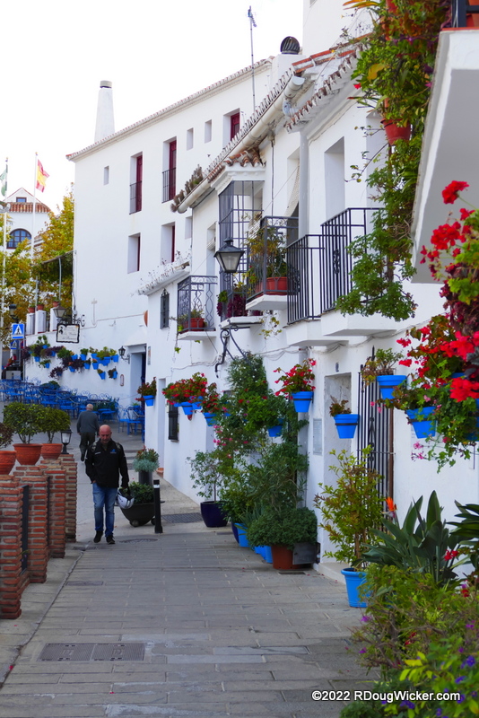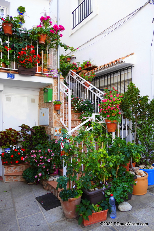 Who knew that white could be so colorful? Mijas is awash in wash. That means: whitewash washes walls wherever one watches willowy wisps of wisteria, wallflowers, wedelia, and watsonia. In other words, splashing against the whitewashed walls are colorful signs and bright flowers.