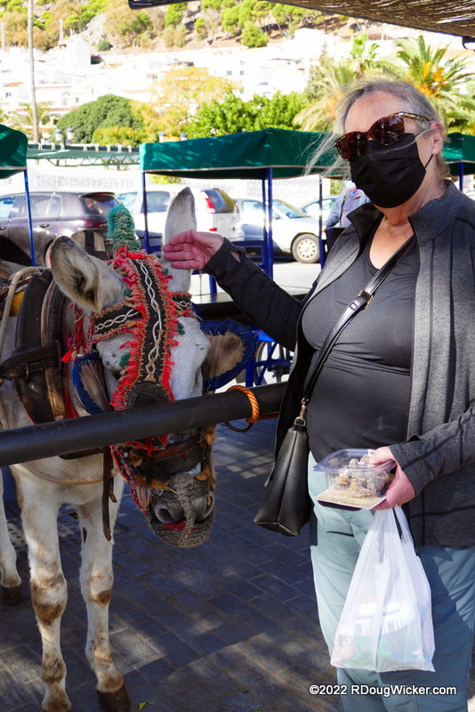 As we headed back to our return appointment with the tour bus, Ursula couldn’t resist stopping by the donkey taxi stand: