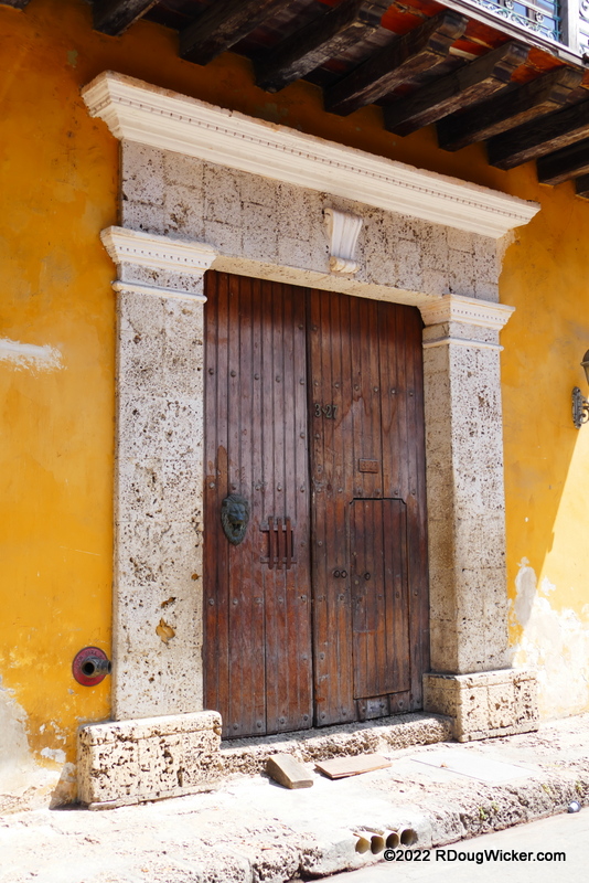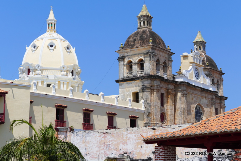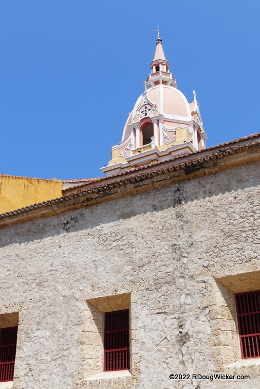 Last Monday in photos from the bastion I showed you a pink dome in the distance. Today I shall reveal what that was. It’s the Metropolitan Cathedral of St. Catherine of Alexandria. We’ll just shorten that to Cartagena Cathedral, like everyone else does. Construction began in 1575 and was completed 37 years later. This beautifully ornate pink and yellow tower looks great from the front: