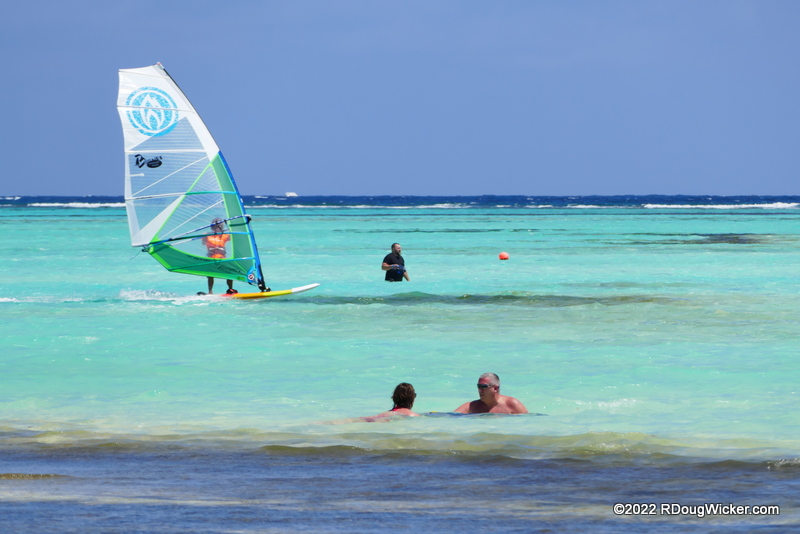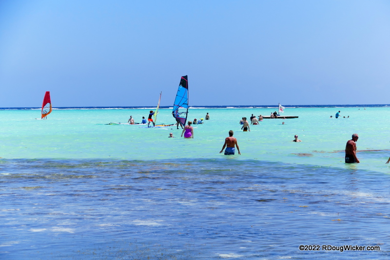 There are several wind surfing schools here, and wind surfers zipped to-and-fro among the many swimmers.