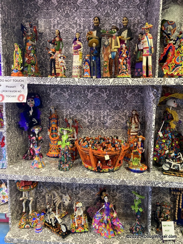 Some of their more popular items are Catrinas (La Calavera Catrina — The Elegant Skull), which are skeletal female figures, and other Dia de los Muertos (Day of the Dead) items. I have in my home office a rather nice depiction of Day of the Dead Beatles reenacting the Abbey Road album cover, for instance. No such statuary here today, but they did have Day of the Dead Freddy Mercurys on hand. Here are some other examples: