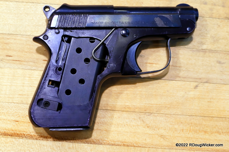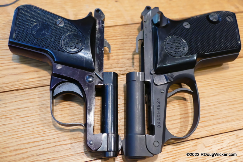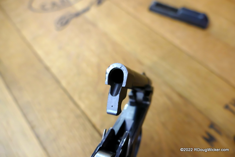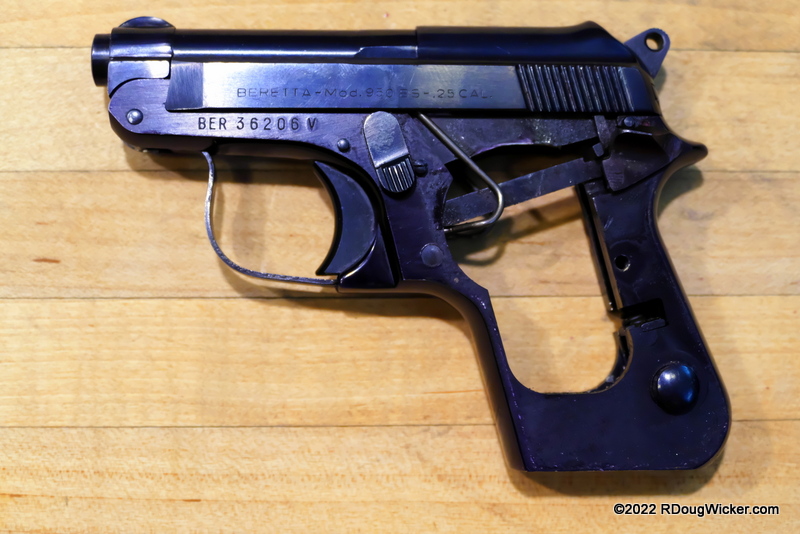 I can hear you now asking, but… but… but where’s that “safety catch” Bond engages? In the photo of the assembled 418, that would be the lever on the frame, just above the trigger. That lever also acts as the slide catch, something the tip-barrel Berettas lack completely. Instead, on the tip-barrels, the lever in that location is the release for the pivoting tip-barrel.