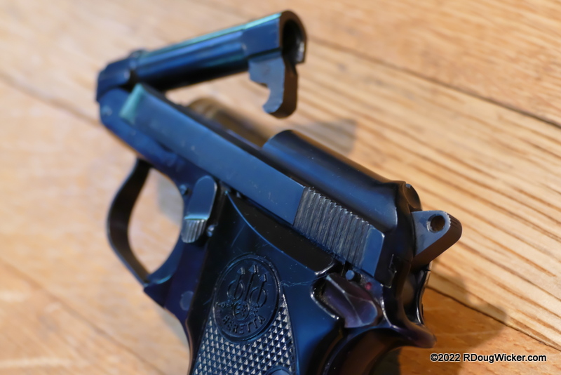 The impotence of the .25 ACP/6.35mm aside, if one were going to arm a Double-0 with a .25 ACP Beretta, the 950 would seem a logical choice. The tip-barrel would allow Bond to drop a round directly into the chamber rather than inserting a loaded magazine into the grip and racking the slide. And to render the firearm safe, he would merely push forward the barrel release and snatch the ejected cartridge as it gets tossed into the air. That would certainly be an iconic image for a cool spy.