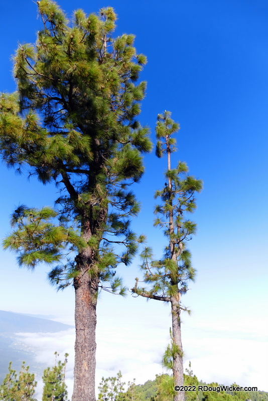 The images you see above, as well as the next two images below, were taken at the Mirador de Chipeque (Chipeque Lookout). This scenic viewpoint is about .4 miles/.65 kilometers off the main road (Carretera de la Esperanza/TF-24) to Teide National Park. To the south southwest rises Teide, and to that volcano’s right, to the west, is an area that is frequently hidden by a dense layer of clouds in one of Tenerife’s several distinct microclimates. The particular microclimate at this viewpoint appears to favor conifer trees: