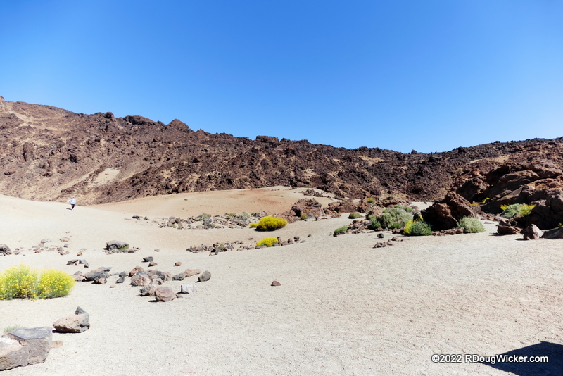 Today I’m taking you on a photo journey to an alien landscape. We’re now deep within the Teide National Park (Parque Nacional del Teide), an area of lava fields from the tallest peak of any Atlantic Ocean island — Teide volcano (12,188 feet/3,715 meters). We’ll begin with images from the area of the park known as Minas de San José. Here’s the view heading out on foot southbound from our parked bus: