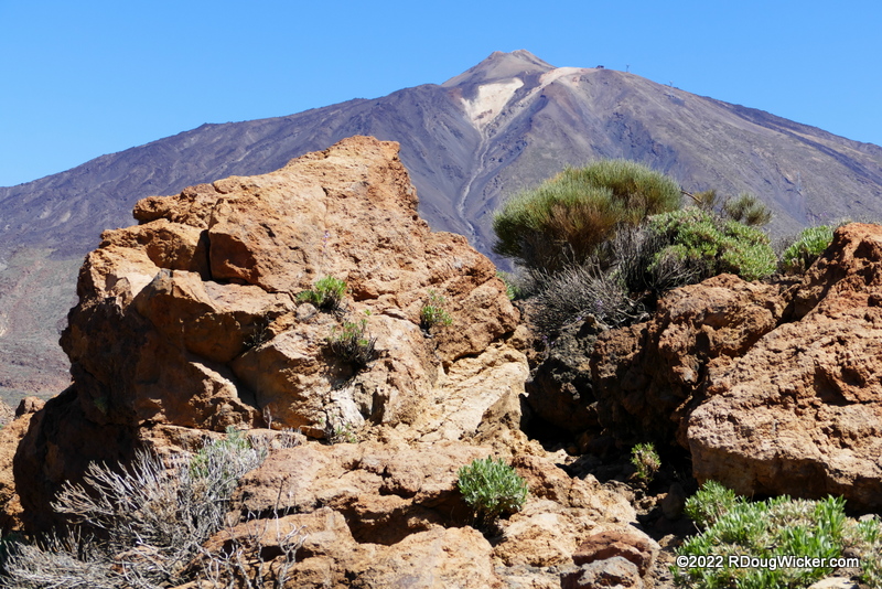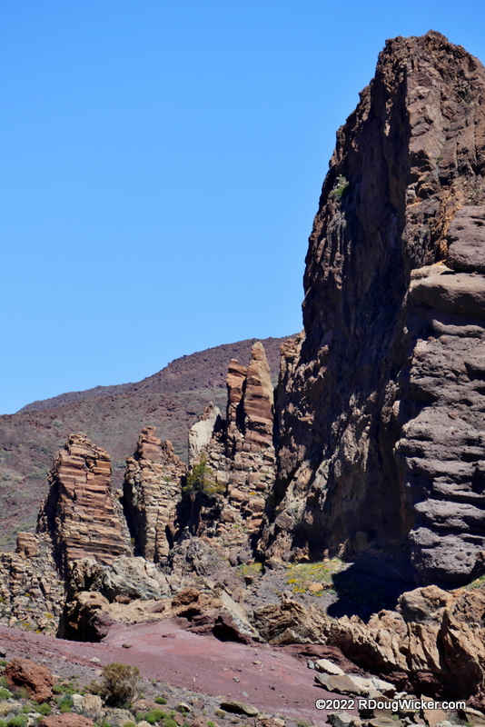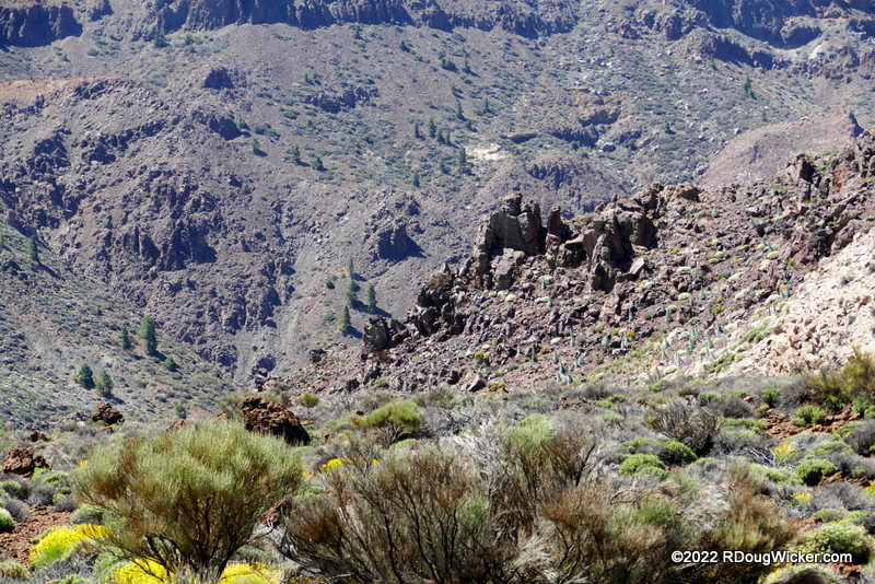 The turnoff into this area is called Mirador de La Ruleta (Roulette Viewpoint). Last week and this we’ve photographically traveled together in the area of the park known as Las Cañadas crater. The base of Mount Teide volcano rises from this ancient caldera. On Wednesday I’ll show you images of an even deeper portion of this ancient crater taken from this viewpoint, but today I’m concentrating on the formations standing guard and the plants adorning this area. As for the area itself, below is a portion of a map of Teide National Park. Today’s photo stop, Mirador de La Ruleta, I’ve marked with a red circle and pointed to it with a black arrow (lower portion of the map, right of vertical center). In case you’re wondering about last week’s photo stop, Minas de San José, I’ve done the same for that location (right side of map, above horizontal center).