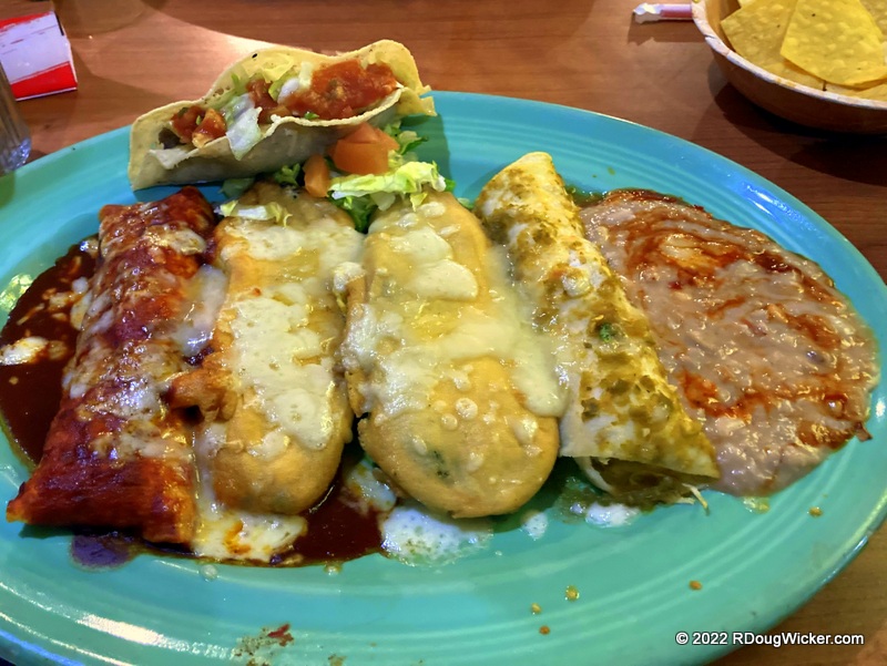 It was date night for Doug and Ursula on a comfortably cool 6 December 2022 evening in El Paso, and the main event was to be at the incredible Plaza Theatre. But before showtime we decided to start early with dinner at one of our favorite Mexican restaurants, followed by a stroll among the Christmas decorations adorning downtown El Paso’s historic San Jacinto Plaza. So, first stop was Gonzalos G&R at the corner of Nevada Avenue and Kansas Street (401 E. Nevada). I had my usual favorite, the combination #17, which includes a cheese chile rellano (see my recipe here: Get Stuffed on Chile Rellanos), beef chile rellano, red beef enchilada, and a green chicken enchilada. With that I also usually throw it a ground beef taco, all of which you can see here: