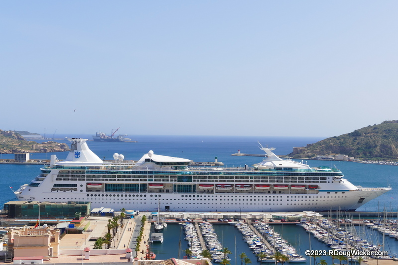 Royal Caribbean’s Vision of the Seas left Ibiza on 18 May 2022, and we arrived at our next destination the following day. What you will view this week and for the next several weeks (I estimate the next four) is Cartagena, Spain. Yes, five weeks is a long time to spend on one destination, but we did a lot during this stop. As I mentioned previously, this particular cruise offered up a fairly unusual itinerary featuring many destinations Ursula and I had not previously seen, and Cartagena is one of those. And as you can see in the photograph below, Vision was moored adjacent to the Cartagena Naval Base. Moored at the base was the submarine you see below, which I believe is one of Spain’s two remaining Agosta-class submarines, the Galerna: