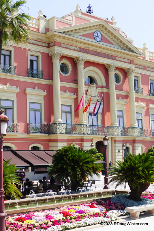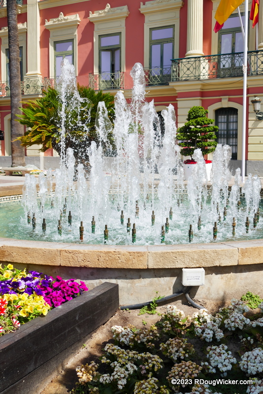 After our tour left Sanctuary of Our Lady of Fuensanta, our next stop was the nearby city of Murcia, Spain. And our first sight in Murcia after alighting from the bus was the Murcia Town Hall (Casa Consistorial de Murcia). This rather impressive edifice was built over a two-year period beginning in 1846. Stretched before the Town Hall are a fountain and flower garden, as you can see above and in these next two photos:
