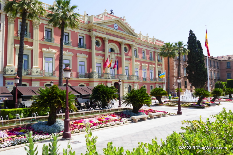 After our tour left Sanctuary of Our Lady of Fuensanta, our next stop was the nearby city of Murcia, Spain. And our first sight in Murcia after alighting from the bus was the Murcia Town Hall (Casa Consistorial de Murcia). This rather impressive edifice was built over a two-year period beginning in 1846. Stretched before the Town Hall are a fountain and flower garden, as you can see above and in these next two photos: