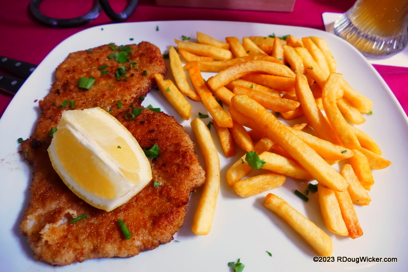 Now for the schnitzels, which were accompanied by pomme frites (what we call French fries). All three schnitzels were excellently prepared, and the pricing was well within what I consider reasonable by European standards. Here is what we each had, beginning with our daughter’s choice, the Schnitzel mit Pfefferrahmsoße (schnitzel with peppercorn sauce):