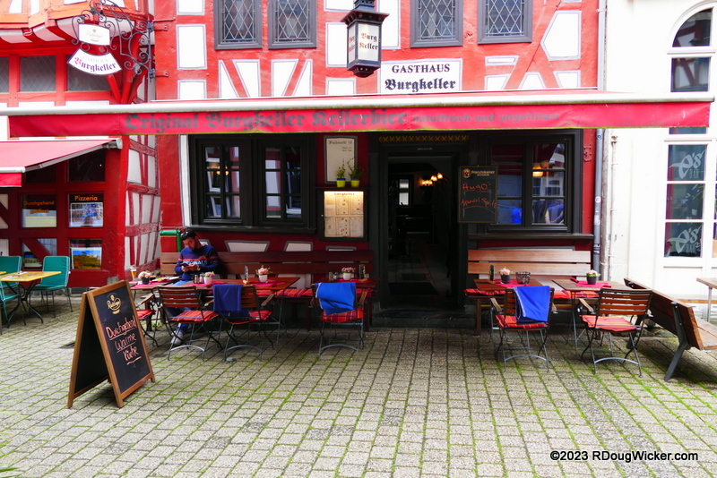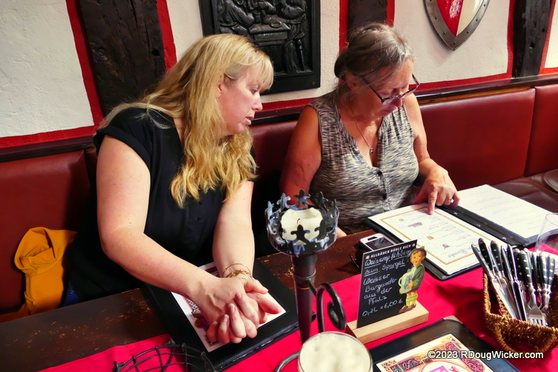 After a busy morning of sightseeing, it was time for the three of us to stop for lunch. We’d seen several possibilities along the, but this rustic place had convinced us to come back and give it a try. So, trekking back into Old Town to where Domstrasse T-bones into Fischmarkt, we found our way back to Gasthaus Burgkeller. The actual address is Fischmarkt 10, in case you’re wondering… or wandering, as the case may be. Whichever it is, we can highly recommend this establishment for refueling the legs and lubricating the joints.