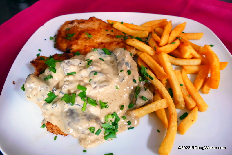 All three started with a base breaded beef cutlet that was pan fried to near perfection. The sauces were superb, with my favorite being the peppercorn. Ursula preferred the cream mushroom sauce. In retrospect, I would probably go with one of the sauce choices rather than the Wienerschnitzel-style I chose, but even mine was delectible. Those sauces made a great dipping option for the accompanying fries, by the way.