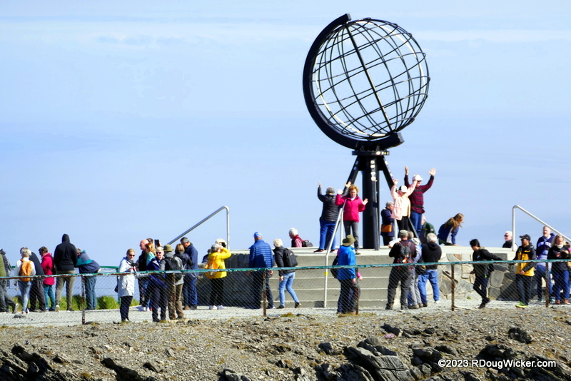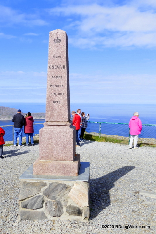 We’re now at our northernmost point in this excursion from Honningsvåg. We’ve reached the Nordkapphallen, otherwise known as the North Cape Vistors Center. We reached Nordkapphallen on 25 June 2022. So, just how north are we? The Arctic Circle is denoted on maps at 66º 34′ North, and Nordkapp reaches almost 5º beyond that — at 71º 10′ 21″ North. Since the summer solstice for 2022 began just the day before, we’re up here at a time during which the sun will not set again for another forty days, or on August 1. Our first view of Nordkapp was at a nearby outcropping upon which is a marker denoting the visit in 1873 of Swedish and Norwegian King Oscar II. This was at a time during which the Swedish and Norwegian monarchies were united (for more information see: Dissolution of the union between Sweden and Norway)