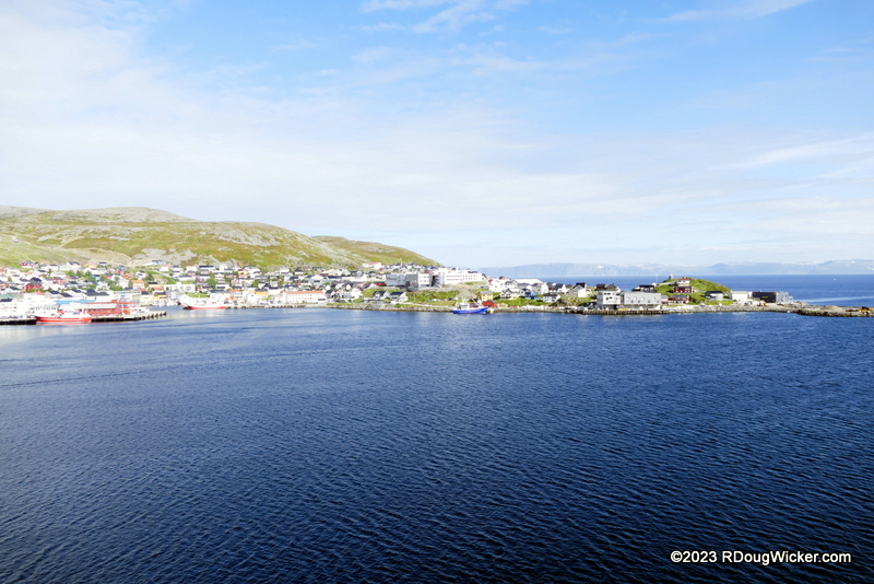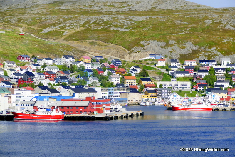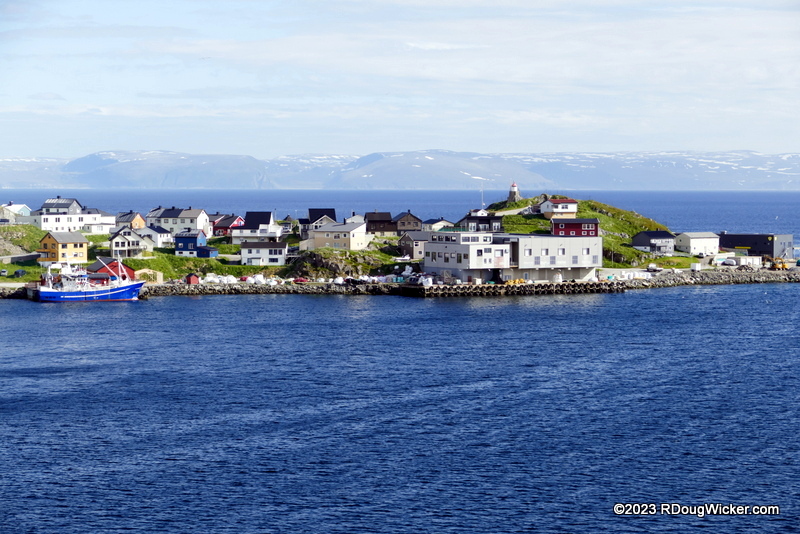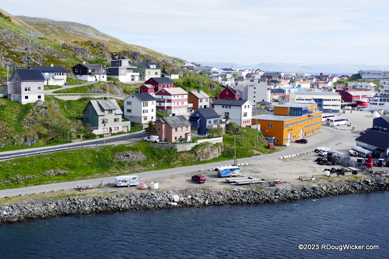 Now we’re sailing off out of Honningsvåg. If you get this chance, stay out on the decks for some magnificent views of the city and the surrounding countryside. Remember those avalanche guards I showed you in last week’s Fun Photo Friday? Well, here they are high above the northern part of the city, along with a protective stand of trees: