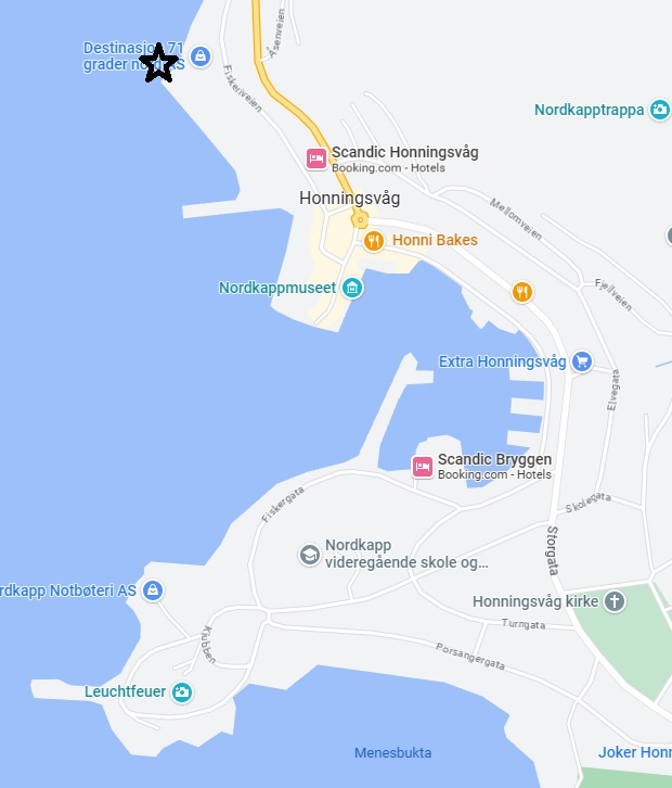 Last Wednesday I took you on a foot tour that wraps around the Honningsvåg waterfront. Today we’re going to view the city from the decks of Royal Caribbean’s Jewel of the Seas as she prepares to set sail for Ålesund. The approximate location of Jewel at the time these photos were taken is the black five-point star in the top left corner of this map: