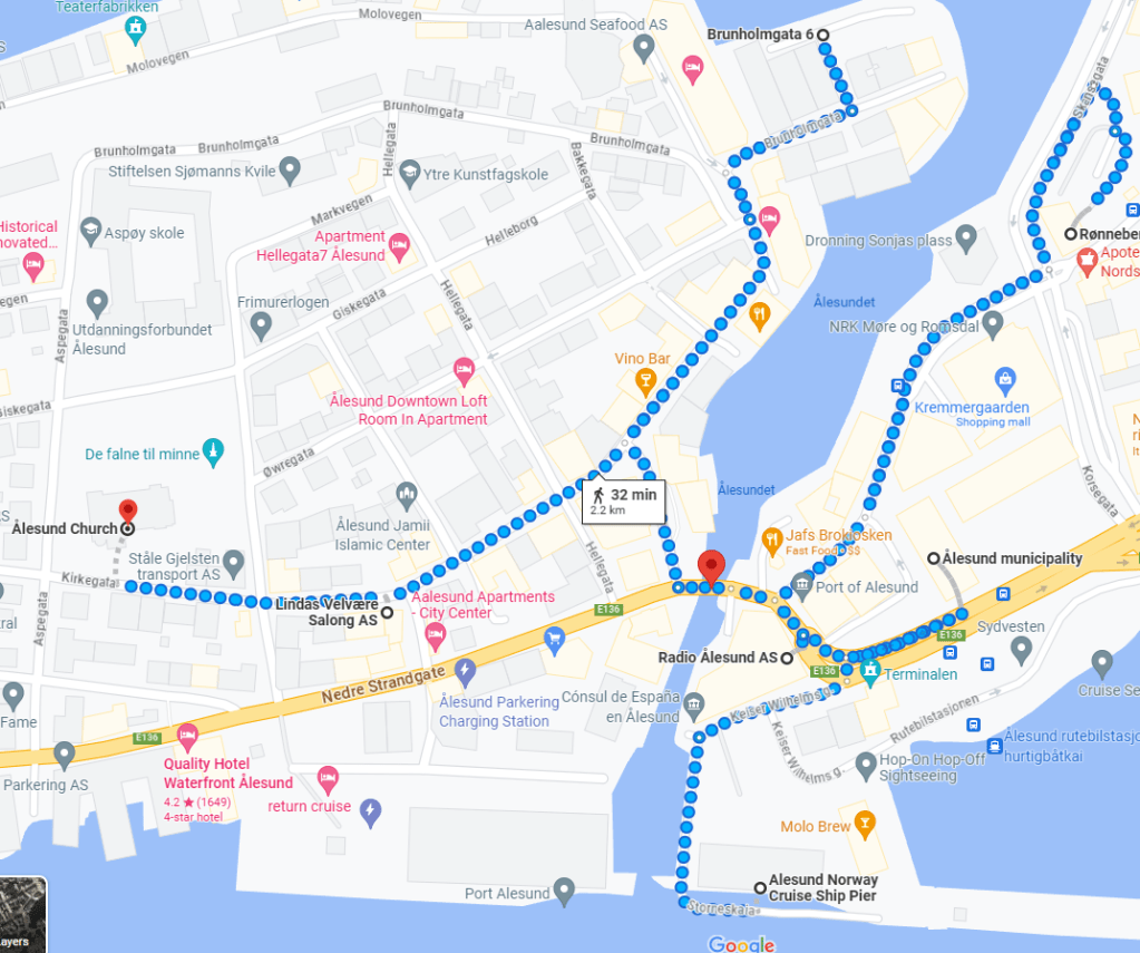 In Monday’s article I gave you a brief glimpse of Ålesund, with most of that collection of photos being taken on or east of the Hellebroa Bridge spanning across the Ålesund Canal. Today I’m going to show you the sights when strolling from the Hellebroa Bridge westbound to the Ålesund Kirke (Ålesund Church). Looking at the map below, we begin at the red position pin near the center and head toward the smaller red position pin toward the left edge: