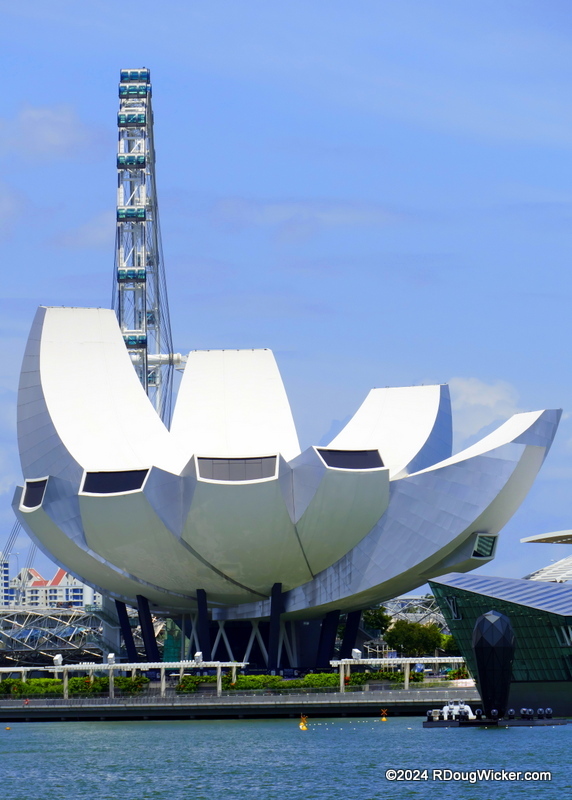 All the photographs presented this week were taken in the vicinity of Marina Bay in Singapore’s Central Area. Perhaps the most recognizable building here is the distinctive three-tower Marina Bay Sands resort you see in today’s lead photo. But a close second would have to be the ArtScience Museum:
