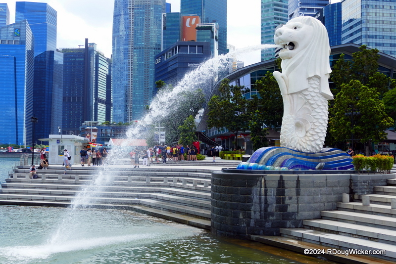 Most of the views I’ve shown you in this series have highlighted “old” Singapore. Since this week I’m finishing up this Singapore series, I thought I would end it with an emphasis on the more modern aspects of this vibrant and dynamic destination. Beginning next week we’ll move on as I present to you destinations we hit via this 2018 cruise ship trek. We’ll be moving on to Indonesia, including (in order) Jakarta, Surabaya, Komodo (there will be dragons), Lombok, Bali, and Java. Until then, let’s get started with Modern Singapore beginning with Singapore’s official mascot, the Merlion. You’ll find two of these mythical creatures, half lion and half fish, in Merlion Park, but the more famous one stands 8.6 meters/28.2 feet tall and regurgitates water into Marina Bay:
