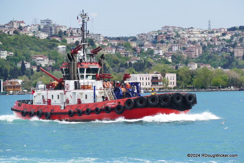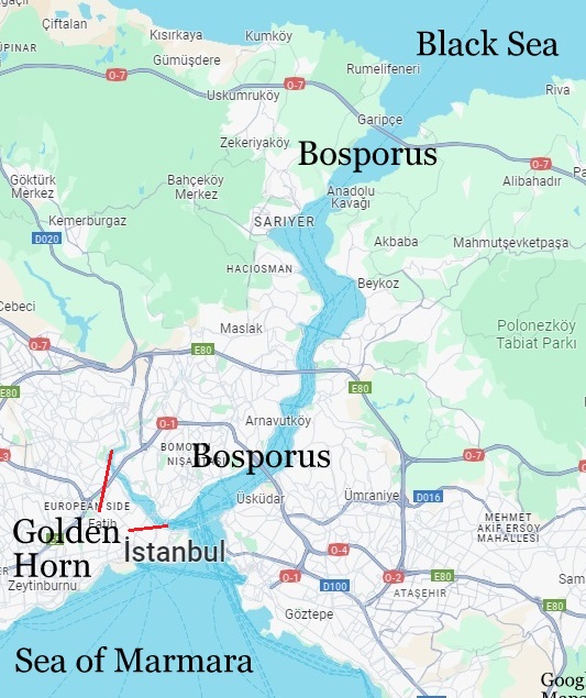 Ursula and I have done this voyage before, so we knew to shop around for the best price. As the boat gets closer to sailing, the fare tends to go down. Tour boats accumulate near the south end of the Galata Bridge, on both the east and west side of the bridge. We embarked on our boat east of the bridge, and disembarked to the west. As for the Galata, it also demarks a separation of sorts — the Golden Horn from the Bosporus. So, let’s head on out, shall we?